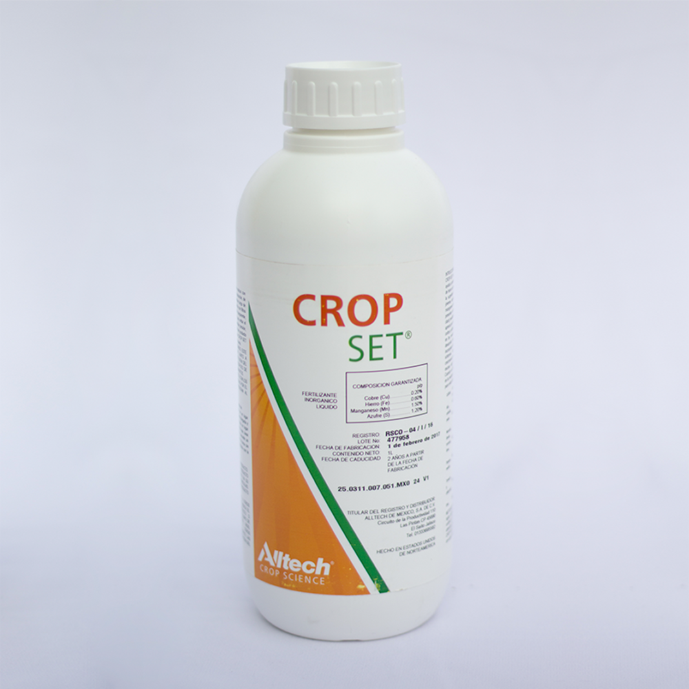 - + precursores hormonais, que são compostos naturais extraídos de uma planta específica chamada Yuuca, que é rica em compostos chamados de saponinas, que são amplamente utilizados nas plantas para sintetizar hormônios vegetais.- Isso torna o Crop Set um produto excelente para pegamento de flores, melhora na uniformidade de frutos e flores e consequentemente produtividade.